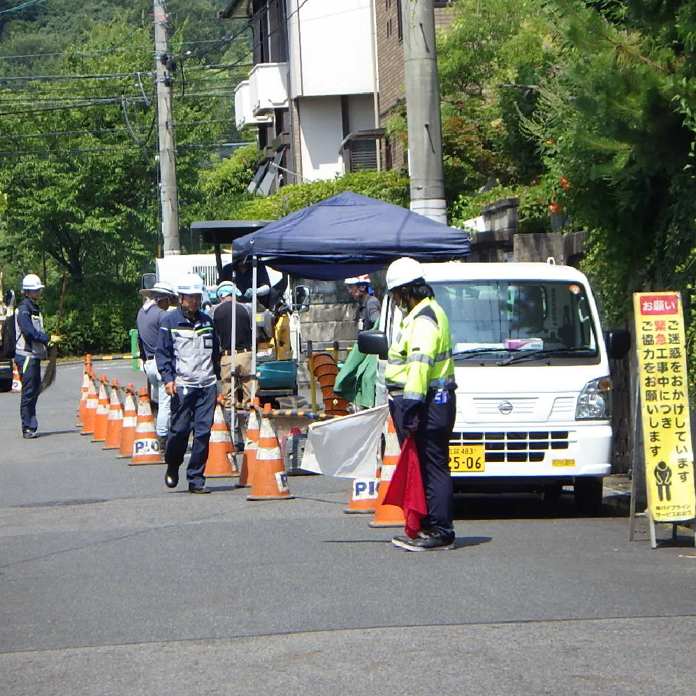 道路で発生したガス・水道漏れ現場とびわ湖ブルーエナジー事務所をネットでつなぎ、事務所の管理者・メンバーの複数視点で現場をサポートしています。