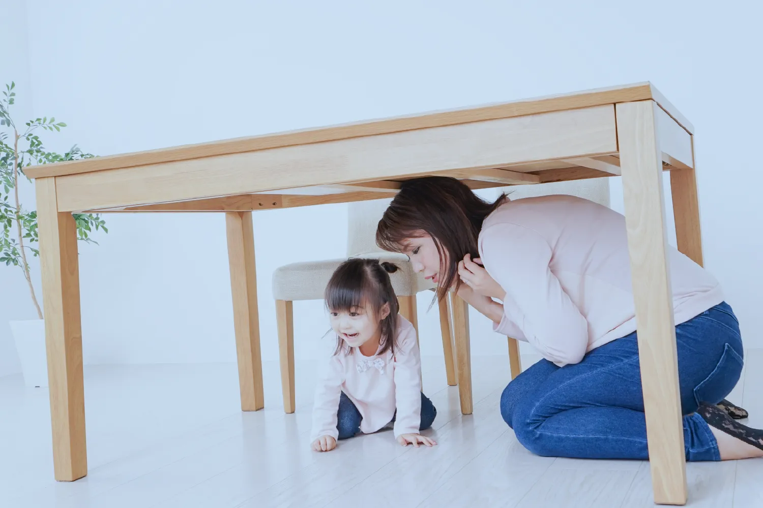 机の下に身を隠すなど